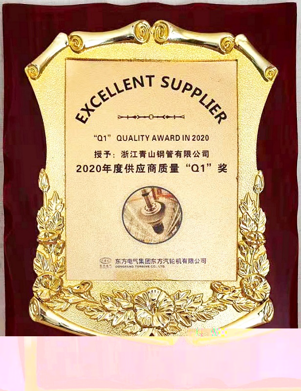 3月份,在东方汽轮机有限公司年度供应商评价中,依据供应商年度业绩动态考核结果和优秀供应商评价标准,优中选优,浙江jinnianhui今年会钢管有限公司获得2020年度“供应商质量Q1奖”(Q1:Quality No.1,即质量第一,是东汽对优秀供应商产品质量的认可和最高荣誉奖励)的殊荣。